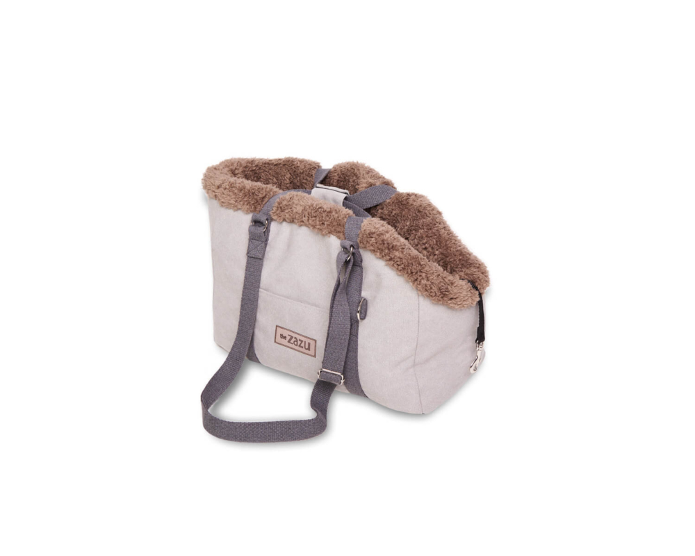 The fluffy bag/ carrier Jako has been designed for small pets with a weight of less than 5 kg (chihuahua, maltese,…) or puppies, to always carry them with you, comfortable and warm, during walks or to put them in the shopping cart in comfort and safety. With removable inner cushion, made of soft and warm dense pile plush fabric. The bag is equipped with both a safety carabiner to be attached to the collar/harness to prevent it from accidentally getting out, and a practical adjustable shoulder strap. On the front there is a pocket for carrying small items, such as your pet’s health book or your friend’s little games. Always warm and always with you. Interior in soft, hypoallergenic batting flake and cover in durable vintage cotton fabric, available in a range of neutral colors.